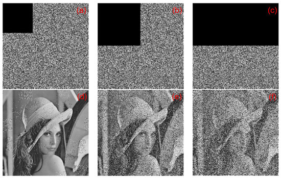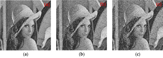 In order to verify the anti-noise performance of the proposed algorithm, Salt and pepper noise with different intensities was added to the encrypted image. The intensities were 10, 15, and 20, respectively, and they were then decrypted. The results are shown in Figure 28. For 10 of intensity, the value is 8758.9 and the value is 8.706. For 15 of intensity, the value is 9302.9 and the value is 8.446. For 20 of intensity, the value is 9866.8 and the value is 8.189. It can be seen that the original image can be basically recovered after the noise image is decrypted. Therefore, the proposed algorithm has a certain anti-noise attack capability.