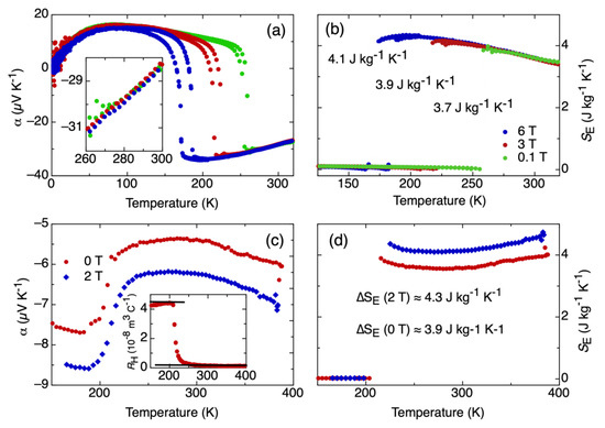 The impact of the applied magnetic field on the transport of the mobile charge carriers shows a clear distinct signature in both materials, which we will discuss in the following. Both magnetic systems behave differently, as best seen in α. In the case of FeRh (Figure 1a), it can be seen that the temperature of the phase transition depends on the magnetic field. This is a striking difference of the SE evaluation by transport experiments and calorimetric measurements that—for intrinsic reasons—do not allow this difference to be unveiled. The α far from the phase transition is independent of the strength of the magnetic field, as emphasized in the inset in Figure 1a that shows an enlarged view of the data in the main panel. In contrast, in the case of LaFeSi (Figure 1c), the α far from the phase transition shows a clear difference in the value depending on the magnetic field. Interestingly, the magnitude of α increases as a magnetic field is applied. The inset to Figure 1c shows the measured Hall coefficient, and the black lines indicate the levels used for the entropy evaluation as was similarly done in [2]. We get a value corresponding to the ∆SE at the phase transition, as depicted in Figure 1b,d. In both cases, we see ∆SE of a comparable magnitude around 4 J K−1 kg−1. Moreover, the absolute values of the obtained SE are also comparable. Furthermore, in both cases, an increase of ∆SE is observed when a magnetic field is applied. However, the apparent origin of the increase in ∆SE for both materials is different. In the case of FeRh, the first order meta-magnetic transition shifts to lower temperatures as the field is applied (Figure 1a,b). Accordingly, α follows a monotonic trend until the phase transition occurs. In the case of the LaFeSi, the amount of Si (x = 1.8) is on the threshold for changing the transition type to the second order [28]. Therefore, the transition temperature does not shift significantly, and only a slight broadening is observed. In this case, it is the change of the over-all entropy level with the applied magnetic field (Figure 1c,d) that causes the increase in ∆SE. In the case of LaFeSi, this could be an indication of the interaction between itinerant electrons and localized moments, causing the increase of SE with magnetic field. There is no such interaction in the FeRh case, as magnetism resides to a dominant part within the conduction electrons. Besides minor numerical corrections to the presented results (compare discussion Ref. [2]), it is clear that this method of analysis provides an insight to the interactions relevant to the conduction electrons that go beyond what typical calorimetric experiments can offer.