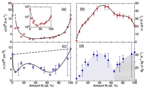 The differential evaluation of a systematic series of homogenized CuNi alloys with respect to their |α|, σ, n, and SE at room temperature is shown in Figure 2. Herein, it is the specific situation of alloys that they typically cannot be accurately calculated or predicted by usual band structure models. However, the full alloy series is experimentally accessible. There are no structural phase transitions reported, and, also, all investigated samples were homogenous with respect to their microstructure and composition by scanning electron microscopy and X-ray diffraction. The dependence of σ on the Ni content (Figure 2a) presents two minima at around 30 at.%-Ni and at around 70 at.%-Ni, which are better seen in the inset to Figure 2a, where the data of the main panel are presented in logarithmic vertical scale.