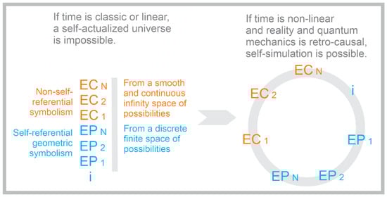 In Reference [14,15], one of the authors discussed the idea of the self–simulation. (After release of our preprint, Christopher Langan contacted us to point out that some of our independently derived ideas are similar to some of his. Upon review of his work [16,17,18], we acknowledge some similarities, such as the use of the term “self–simulation” [17]. Where “simulation” is defined as something representing something else, a self-simulation is a case where something simulates, i.e., represents or creates itself. The universe creating itself is a rather ancient idea. To our knowledge, the modern idea of reality as a code–in–action was first introduced in 1969 by Finkelstein in The Space–Time Code [19]. In essence, the work of both Langan and ourselves is a synthesis of three general ideas: (1) reality is made of information in the form of code/language [2,3,19,20,21,22,23], (2) reality is a transtemporal system, where things from one time can influence things in other times [24,25,26] and (3), the substrate of this information is panconsciousness [12] that emerges from itself, as the creator or simulator of itself. Differences in our synthesis include our connection to self-referential vs non-self-referential symbols, strange loops, a finite possibility space for physical information, a unified free energy principle, quasicrystalline codes and details on the nature of retrocausality, to name a few). In 2017, he put forth the idea that a digital physics–based quantum gravity theory can be based on simplex–integers or shape as number [27]. A unification of the numerical aspect of the digital physics view and geometric aspect of the materialistic view was proposed, where the shapes that form reality are equivalent to numbers. In Reference [15], he discussed how these shape–numbers as physical information can act as the elements of a quasicrystalline mathematical code. This view provides an origin for the panpsychic substrate of reality, where nothing “just is” and where there is a logically self–consistent origin story for the panpsychic substrate as a self–simulation strange loop. The logic is based on evidence that consciousness can evolve to increase in magnitude, as it has done here on Earth from early lifeforms to humans. Human minds can run primitive simulations, such as dreams. Sufficiently large minds can be networks of smaller minds and can, in principle, evolve to enormous levels in the future to run fully realistic universal self–simulations. A panpsychic self–simulation unifies notions from emergentism and panpsychism by showing that panconsciousness can emerge from or self–simulate itself.