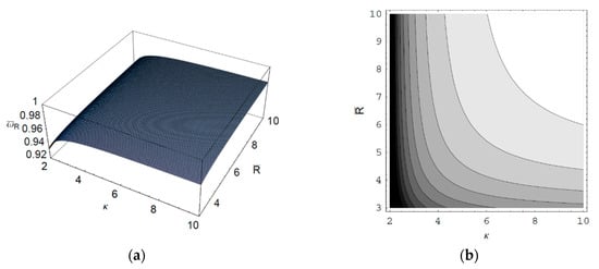 (a) Surface plot; (b) Contour plot of the scaled real part of the wave frequency of the SCW as a function of the spectral index and the scaled radius of the cylindrical plasma column for and the first-harmonic, i.e., .