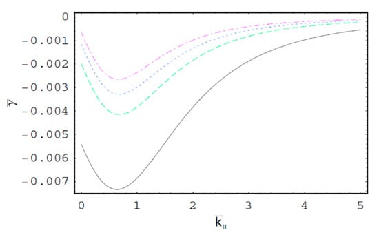 The scaled imaginary part of the wave frequency, i.e., the scaled damping rate , as a function of the scaled axial wave number for ; ; and the first-harmonic, i.e., . The solid line is the case of . The dashed line is the case of . The dotted line is the case of . The dash-dot is the case of , i.e., Maxwellian case.