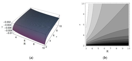 (a) Surface plot; (b) Contour plot of the scaled damping rate of the SCW as a function of the scaled radius of the cylindrical plasma column and the spectral index for and .