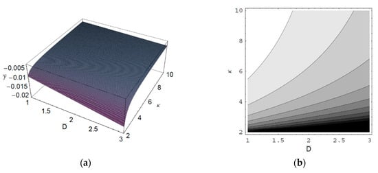 (a) Surface plot; (b) Contour plot of the scaled damping rate of the SCW as a function of the scaled diffusion coefficient and the spectral index for and .