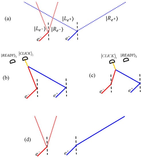 Possible electron–positron interactions and their outcomes. (a) The setting. (b,c) Annihilation. (d) Oblivion.