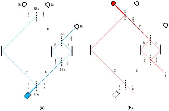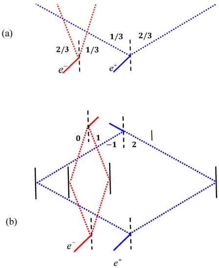 We begin with a very basic interaction [] that offers a key for understanding quantum non-events. We let an electron and a positron pass through two Stern–Gerlach magnets (drawn as beam-splitters, Figure 1). The magnets split the particles’ paths according to their spins in the x-direction: