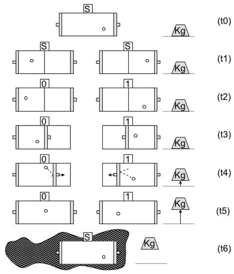 Consider the setup in Figure 1. At a particle is placed in a box. At a partition is inserted exactly at the center of the box so that the particle is trapped in the left-hand side L or the right-hand side R of the box. At a measurement of the location of the particle, left or right, is carried out and the outcome of the measurement, 0 or 1, respectively, is registered in the memory state of the measuring device. At the partition is replaced by a piston (in accordance with the measurement outcome), which is subsequently pushed by the particle at . The piston is coupled to a weight located outside the box which is raised during the expansion. At the particle is again free to move throughout the box and the weight is at its maximal height. At the memory of the device is erased and returns to its initial standard state. The particle returns to its initial energy state by receiving from the environment the energy it has lost to the weight. The cycle of operation is thus closed. By this last statement we mean that everything returns to its initial state except for the energy transfer from the heat bath (environment) to the weight (see our [7,18,19]).