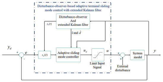 A block diagram describing the proposed disturbance-observer-based adaptive terminal sliding mode control (ATSMC) technique with the extended Kalman filter (EKF) algorithm.