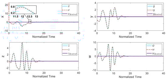 The disturbance-observer-based ATSMC with EKF was used to synchronize the chaotic system. The case with little knowledge of the slave system’s parameters will be investigated, and in this way the robustness of the proposed method will be proven. The slave system is taken from Equation (43), and the master system is as follows: