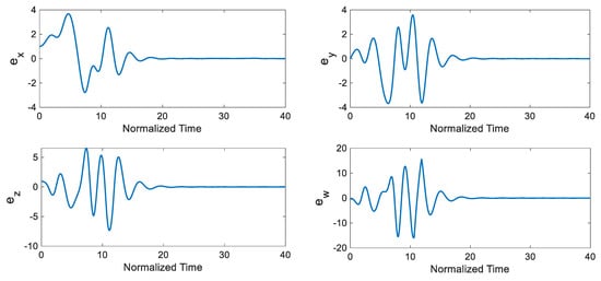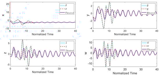 The master system’s parameters were , , , , , and , and the initial conditions were [−1, −1, −1, −1]. The case with little knowledge of the slave system’s parameters was considered by setting them to 70% of their actual value, i.e.,