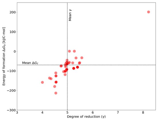 Because all necessary information for repeating this calculation are contained in curated genome-scale models, it is rather straight-forward to transfer this old technique to modern modeling approaches. To demonstrate this, we determine the -values for all genome-scale models contained in the BiGG database [], using the specified biomass reactions. Figure 1 shows the distribution of energies of formation as function of the degree of reduction.
