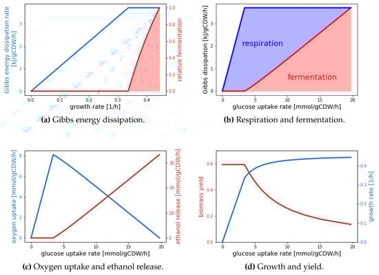 Remarkably, these results are in very good quantitative agreement with experimental data (cf. Figure 2 in []). The virtue of the black box model is its extreme simplicity, which offers explanations for the observed behavior. The critical growth rate (/h in Figure 3a) is reached when pure respiratory growth dissipates the maximal Gibbs energy per time. When this critical growth rate is exceeded, metabolism gradually shifts towards fermentation, because fermentation requires less Gibbs energy per C-mol biomass generated. Thus, higher growth rates can be obtained at the expense of a lower yield (Figure 3d), which is also manifested by the sharp increase in carbon uptake rate (Figure 3d). Naturally, a black box model is unable to explain or predict internal flux distributions. One of the key predictions of the detailed constraint-based model presented in [] entails that in the limit of pure fermentative growth approximately 40% of the Gibbs energy is dissipated by only two enzymes, pyruvate decarboxylase and pyruvate kinase.