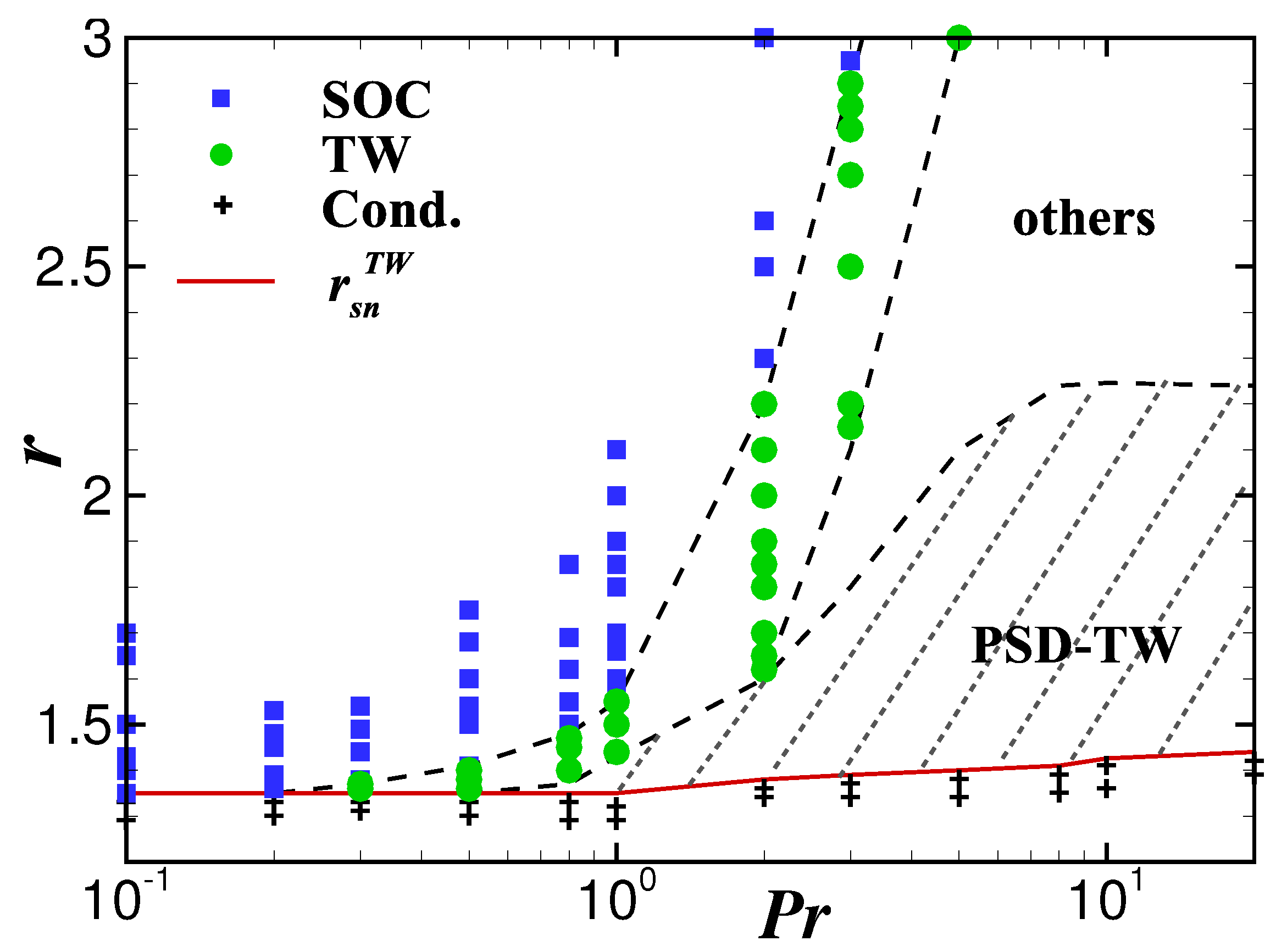 - Zhao, B.; Tian, Z. Numerical investigation of binary fluid convection with a weak negative separation ratio in finite containers. Phys. Fluids 2015, 27, 074102. [Google Scholar] [CrossRef]
