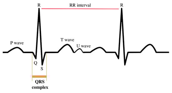 The focus in this paper will be in the QRS complex, in particular, in the RR interval time series—a set of the time intervals between two consecutive R peaks. The R peaks are often classified as normal (N) or abnormal. Many studies use the normal to normal (NN) intervals time series instead of the RR ones, meaning that the time series used are the set of time differences between two consecutive R peaks, which are classified as normal. Numerous methods can be used to detect the R peaks. One of the most used ones is the Pan–Tompkins algorithm [12]. However, that topic will not be explored in this work. Please see Physionet for more details [13].