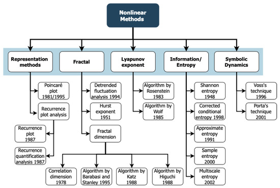 In past years, the scientific community published some review papers related to the nonlinear methods applied to heart-rate time series. In 1996, Mansier et al. [7] considered that the most widely used nonlinear methods of heart rate were the correlation dimension, the Lyapunov exponents, and the approximate entropy. The authors applied these methods to mouse heart-rate data before and after a single atropine injection. They concluded that the dose results in increased complexity of an assumed heart-rate attractor. Voss’s review in 2009 [8] summarizes some of the heart-rate variability (HRV) indices derived from nonlinear and fractal dynamics (fractal, entropy, symbolic dynamics measures, and Poincaré plot representation). It shows the relevance of the methods in clinical research, and it reflects on essential aspects related to their practical applications, although giving neither a mathematical description of algorithms nor the relations between methods. In 2016, Godoy [9] presented a literature review of linear and nonlinear methods to predict cardiovascular disease and concluded that nonlinear methods are more efficient than the linear ones. However, the paper lacks presenting the mathematical description of the algorithms as well as the relations between methods. In 2018, the review by Nayak et al. [10] dealt with the theory and recent applications of the nonlinear electrocardiogram signal analysis methods. In 2019, the review of García-Martínez et al. [11] analyzed nonlinear methods applied to electroencephalographies (EEG) signal analysis for emotion recognition. The last three reviews discussed included neither the representation methods (Poincaré plot and recurrence plot analyses) nor the symbolic dynamics. Furthermore, they did not refer to the limitations and advantages of each technique.