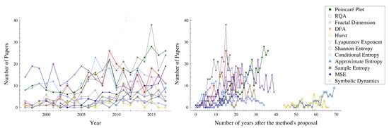 The number of papers published in the last 20 years (from 1997 to 2017) for each measure (or group of measures) are displayed in Figure 3. Note that we did not use the 2018 information once we considered that those values were incomplete at the time of the search. The results on the left panel show that, although in the early years the fractal dimension (FD), the Poincaré plot (Pplot), and the approximate entropy (ApEn) were the most used methods, in the most recent years, the most applied methods to HR are the Pplot, the sample entropy (SampEn), and the multiscale entropy (MSE), followed by the detrended fluctuation analysis (DFA) and the ApEn. Moreover, the right panel of Figure 3 exhibits a tendency to reach higher values of the number of papers applying the method 10/20 years after the method’s proposal. This plot emphasizes the conclusions of the previous one that the SampEn and the Pplot are two of the most applied methods. Note that, for some methods, there are no papers published immediately after the method was proposed. This might be due to several reasons, such as the method was just applied to the HR time series some years after the proposal or we had not found papers available online before 1975.