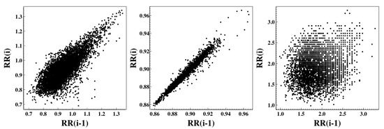 The Poincaré plot (Pplot), also known as a return or delay map, allows assessing the heartbeat dynamics based on a simplified phase-space embedding. The Pplot is a two-dimensional graphic (scatter plot) in which each RR interval, , is plotted as a function of the previous RR interval, . The Pplot analysis is an emerging quantitative-visual technique, whereby the shape of the plot provides summary information on the behavior of the heart [14,15]. For a healthy heart, the cloud of points presents a comet shape oriented along the line of identity; the cardiac heart-failure dynamics are characterized by a stretched elliptical-shaped cloud of points also along the line of identity. In the atrial fibrillation (AF) case, the cloud of points presents a more circular shape, similar to what happens with the white noise time series (see Figure 4).