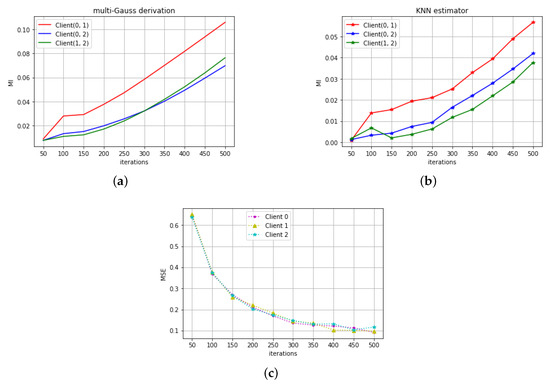 Figure 1a,b shows the MI estimations in the regression task by two methods. The unit of MI is bit. Client(0, 1), Client(0,2), Client(1, 2), respectively, indicate MI between model parameters as Client 0 and 1, Client 0 and 2, Client 1 and 2. From the results of both methods, we can see that the MI between all of three clients are always larger than zero throughout the whole training epoch, which shows the correlation between different clients in the federated mode. Figure 1c shows the decrease of MSE with training iteration. All three models were trained well in their own data, and all of them eventually converge to a similar MSE with similar training patterns. Comparing to similar MSE variations, Figure 1a,b show the difference of MI between different client-pairs.