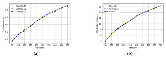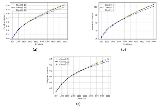 We detect the distance between the model parameters at different clients using three regular distance metrics: Euclidean distance, Manhattan distance, Chebyshev distance, and refer to them as , respectively. Specially, to calculate the distance between two model parameters, we firstly calculate the distance between two samples of the client computed parameters, and then average the result over all samples, i.e.,:
