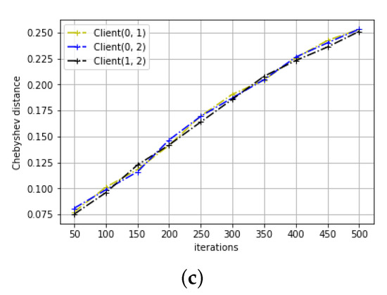 Figure 2a,b shows the obtained MI estimation. The unit of MI is bit. Similar to the previous experiment, the MI between all of three clients is larger than zero throughout the training phase, which shows that there exists correlation between the clients’ parameter models. Figure 2c shows improvement in recognition accuracy with training iteration. All of three models also have similar training pattern like in regression tasks, but still looks different in MI estimations. These imply that although different clients in a same learning task have similar training trajectory, the MI can still the subtle difference between them.