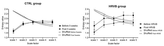 Refined composite multiscale entropy (RCMSE) analysis of RR interval time series. Sample entropy values at time scales 1 to 5 during stressful cognitive tasking are reported. The RCMSE curves for the surrogate shuffled time series are also presented. The entropy index represents the trapezoid approximation of the area under each curve: (left) Unchanged values in the control group; (right) Higher entropy after heart rate variability biofeedback (HRVB) training.