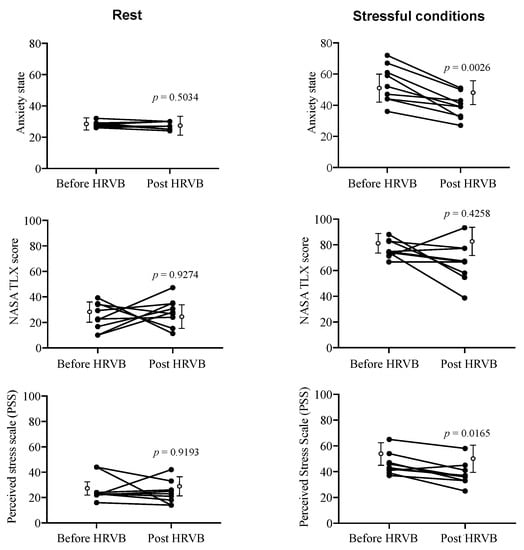 Individual changes in psychological markers induced by five-weeks HRV biofeedback training (HRVB) (filled circles) at rest (left) and during stressful cognitive tasking (right). Open circles indicate mean and standard deviation obtained in control group and illustrate the absence of changes.