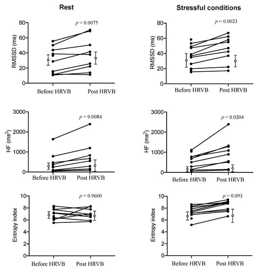Individual changes in RMSSD, HF-HRV, and Entropy index markers induced by five-weeks HRV biofeedback training (HRVB) (filled circles) at rest (left) and during stressful cognitive tasking (right). Open circles indicate mean and standard deviation obtained in control group.