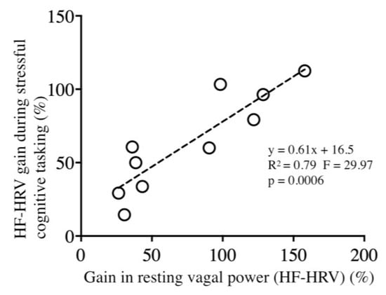 We highlighted a link between training benefits at rest and those that were observed during stressful cognitive tasking Figure 4; those participants with the most important gain in resting HF-HRV (resting vagal tone) correlatively demonstrated the most important gain in HF-HRV during stressful cognitive tasking (R2 = 0.789, F = 29.97, p = 0.0006, Figure 4).