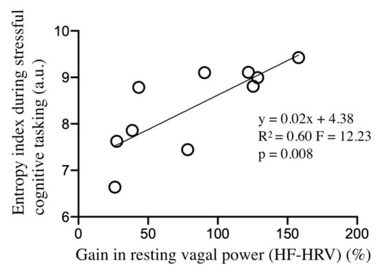 To obtain a realistic interpretation of a link between system complexity and signal complexity in our conditions, a pre-requisite is that autonomic responses and long-term adaptations match with previous observations that consistently report on the link between vagal activity, anxiety, and interconnectivity in the neurovisceral circuitry when the brain has to respond emotionally and cognitively. A low resting vagal HRV and/or an excessive vagal tone withdrawal when one faces an acute challenge has been associated with poor health and poor effectiveness in coping with a variety of stimuli and challenges []. These defects in vagal autonomic activity are generally associated with cortico-subcortical dysfunctions [], which lead to highly susceptibility to amygdala disconnection and a corrupted behavioral and cognitive flexibility. Prolonged exposure to stress is one obvious candidate at the origin of such dysfunctions, being reflected in impaired heart vagal control. In agreement, our moderately stressed participants demonstrated low vagal resting activity and, more critically, a blunted vagal response during stressful tasking Table 1 before HRVB training; remarkably, the vagal activity rose after daily HRVB training thanks to repeated bottom-up vagal stimulations of the brain, especially during stressful cognitive tasking [,]. Previous studies have shown that HRV biofeedback training has the capacity to enhance inhibitory control [] and improve overall self-regulation, autonomic stability, and psychosocial well-being [], which can be explained by true persistent CAN adaptations. The present work brings about additional support for effective neurovisceral remodeling, being illustrated by measurable benefits of HRVB training that extended beyond resting conditions, in vagally-mediated responses to stressful cognitive tasking, which illustrates profound changes that can be mobilized under different conditions. The correlation between gain in resting and stressful cognitive tasking gain in vagal activity highlights the extended ability to mobilize new resources thanks to the improved CAN dynamic organization Figure 4.