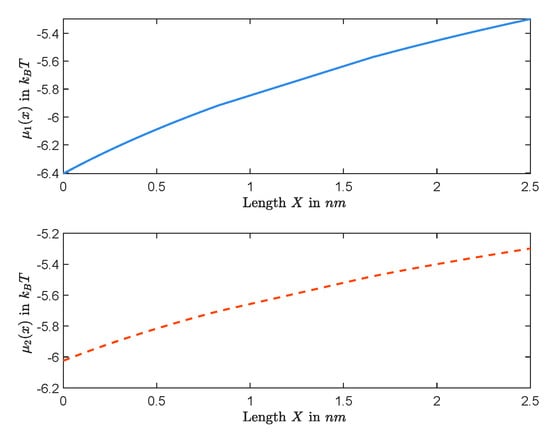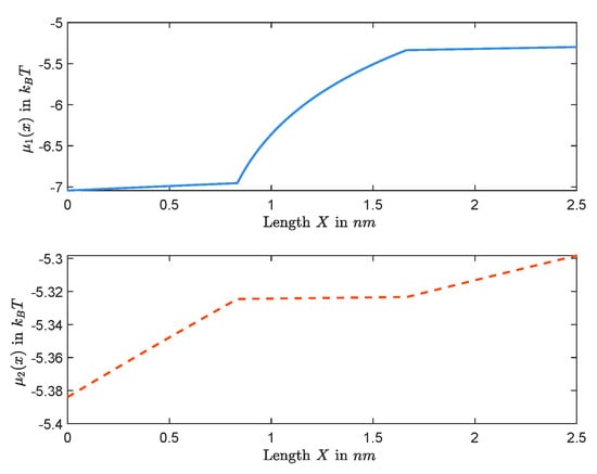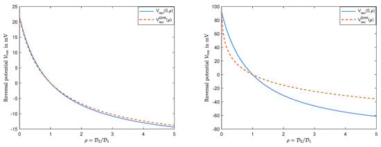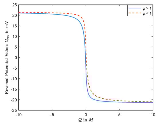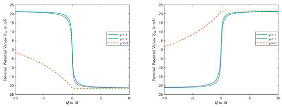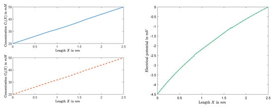 It was observed in [] that the Nernst–Planck equation in Display (9) (with dimensionless quantities) gives, for ,