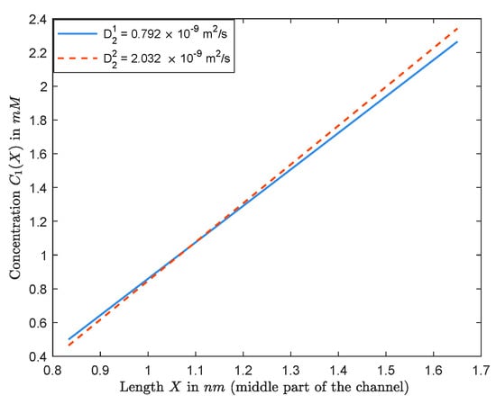Recall that fluxes and are equal for this case and let J denote it. For any permanent charge , once a solution of System (15) is obtained, it follows from matching equations (see Appendix in []) that J is given by