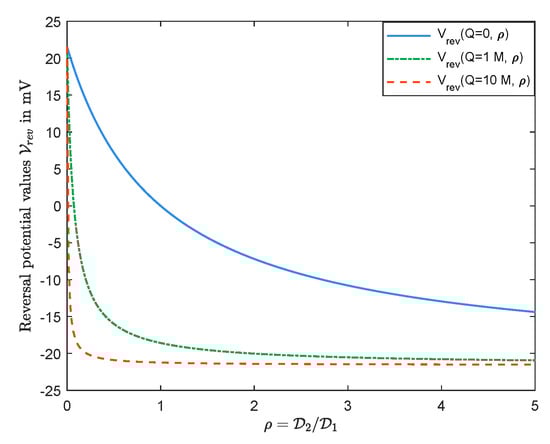 - a characterization of monotonic dependencies of the reversal potential on the ratio of diffusion coefficients in terms of different conditions on the boundary concentrations (see Section 2.2), as well as effects of un-equal diffusion coefficients on signs of zero-current flux and its dependence on permanent charge (see Section 2.1);