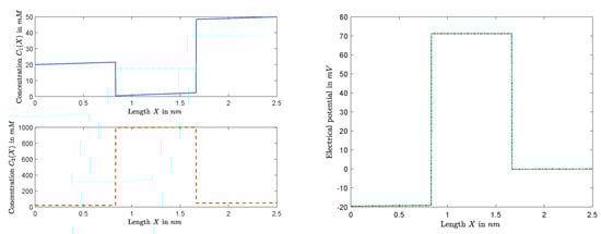 The different permeability of the membrane determines the zero membrane potential (voltage) to different types of ions, as well as the concentrations of the ions, the permanent charge, and the shape of the channel. Denote current , and the fluxes , for , to include the dependence on Q too. We call the zero-potential current and the zero-potential fluxes, respectively, when . For any given value of membrane potential V, approximation formulas for the current , for small and large values of permanent charge Q, are provided in [,], respectively.