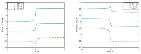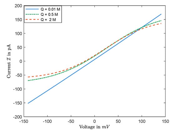 Figure 13 illustrates some of the above conclusions. In addition, it suggests that the monotonicity of holds for all values of permanent charge, not only for small or large values. We emphasize that the monotonicity of current I with respect to permanent charge Q is just true for zero membrane potential, i.e., . Indeed, one should recall from Section 3.2 that, when , then the current I is not monotonic in Q.