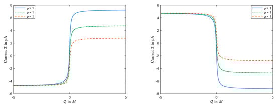 The sign of is determined by the boundary conditions, independent of the permanent charge. Nevertheless, as expected and seen in Figure 12, the magnitudes of ’s, and, consequently, the sign and the size of the current do depend on in general. (Here, would be the nonzero value of the permanent charge in dimensional form.) Treating as a parameter, the current is a function of . The numerical observations in Figure 12 indicate that,