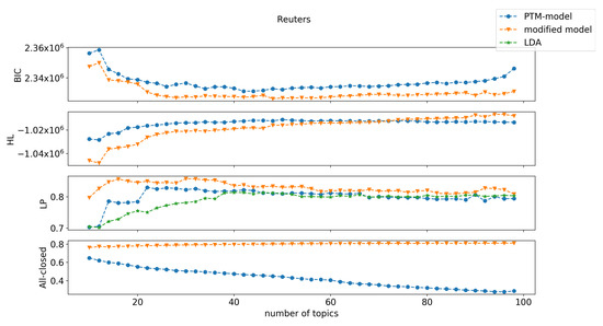 When updating the model structure, we implement an iterative loop in which all the topic switches u are visited one by one. If the current change reduces BIC, we accept the change; otherwise we keep the switch unchanged. Note that in updating the word switches v, we update all the word switches for a single word jointly to see if it is optimal to choose all the switches related to a single word to be closed (i.e., to specify that this word is completely uninformative). This process is repeated over all the switches until there is no decrease in BIC or until we reach a pre-defined maximum number of iterations. We first update the word switches u until convergence; then we update the topic switches v until convergence. Then we go back to the E-step. Note that when updating the word switches, for each single search of all the switches related to one word, we have three configurations. All switches are closed, all switches are open, or some are closed and some are open. We compute the minimized BIC for each configuration, and then choose the configuration that has the lowest BIC value.