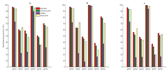 Statistical powers for the six simulated QTNs in three simulation scenarios. (a) only six QTNs’ additive effects; (b) six QTNs’ additive effects and polygenic background effect; and (c) six QTNs’ additive effects and three other pairs of QTNs’ epistatic effects.