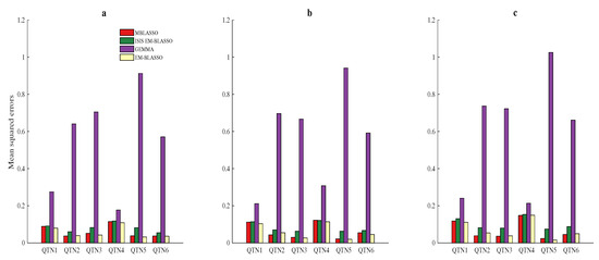 Average mean squared errors (MSEs) for the six simulated QTNs in three simulation scenarios. The description of (a–c) is the same as that in Figure 2.