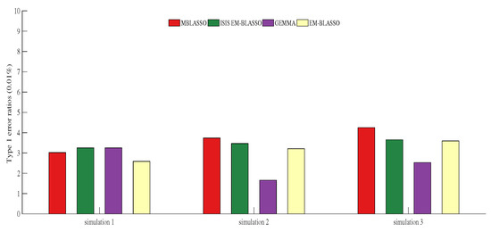 Type 1 error ratio, also known as false positive ratio, is an important problem that needs to be overcome in GWAS. In Simulation 1, they are 0.0302%, 0.0325%, 0.0325% and 0.0259% for MBLASSO, ISIS EM-BLASSO, GEMMA, and EM-BLASSO, respectively, and GEMMA has the lowest Type 1 error ratio in Simulations 2 and 3 (Figure 4). Note that all Type 1 error ratios are less than (Figure 4 and Tables S1–S3), which indicates that all the four algorithms ensure the Type 1 error is at a very low level. A violin plot of Type 1 error ratios for MBLASSO in three simulation scenarios is shown in Figure S1c.