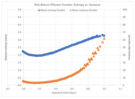 where is the percent return on security i in period j, and represents the price of security i in period j. For this example, the percent returns were discretized simply by using interval sizes of one basis point, with the minimum and maximum across all returns used as support boundaries; i.e., , all in units of basis points. According to this dataset, the minimum return across securities was −44 basis points and the maximum return was 42 basis points, for a total of possible probability states. The ten randomly selected securities and the sample means, variances, and entropies of their respective mean weekly returns over the ten-year period are presented below in Table 1, in which bps and nats are respective abbreviations of basis points and natural units.