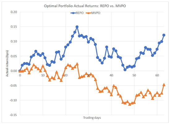 Optimal portfolio actual returns: return-entropy portfolio optimization (REPO) vs. mean-variance portfolio optimization (MVPO).