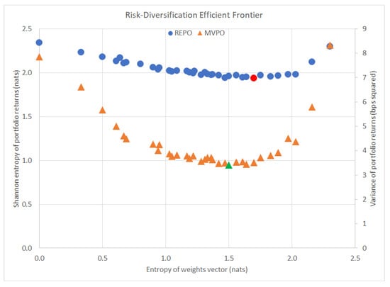 (1) Large weights assigned to high risk assets. REPO lends itself very well to highly diversified portfolios, more-so than MVPO. Figure 4 below shows a plot of the most risk-averse portfolios according to each method and their corresponding diversification levels, measured by the Shannon entropy of the portfolio weight vector, . The optimal minimum risk portfolio from MVPO is highlighted in green with a diversification level of only 1.5048 nats. The optimal minimum risk portfolio from REPO is highlighted in red with a diversification level of 1.6957 nats, almost 13% more diversified than the MVPO portfolio.