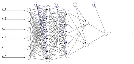 Importantly, multiple deep learning architectures exist and, as interest and research in this area increases, the field will continue to flourish. However, fundamental to of all these methods is the feedforward multi-layer perceptron (MLP). Feedforward MLPs consist of densely connected layers, in which the input affects each subsequent layer up until the final output layer. Figure 2 presents an example of MLP with six input neurons (features), one output neuron (target), and three hidden layers consisting of nine, five, and two hidden neurons, respectively (with additional biases marked in blue). There is no well-defined approach to choose the number of hidden layers and nodes, and hence they effectively are the first of many hyper-parameters to tune. The choice of output layer is driven by the modeling task. For example, for a binary classification task the output layer contains only one node predicting the probability of success, while for a multiclass classification task the output layer consists of the same number of nodes as the number of classes being predicted.
