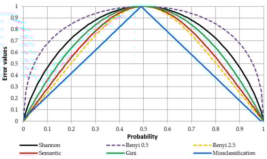 In order to present the relation between various losses/errors for binary classification problem, Figure 3 is prepared. In this figure the horizontal axis presents the probability that for a particular observation the true value equals 1 (while having two classes 0 and 1). The vertical axis presents values of a particular error/loss function. For instance, in these settings the Shannon entropy can be calculated as follows (this approach holds for other errors as well). Let’s assume that the probability for the class 1 equals 0.7. Then, the probability for the class 0 equals 1–0.7. Finally, error value equals . The blue solid line presents misclassification error, the green solid line denotes Gini error, and the black solid line represents standard entropy loss (Shannon, Equation (5)). The semantic loss is depicted by the red solid line while generalized entropy (Rényi) loss is presented by the yellow and purple dashed lines for equaling 0.5 and 2.5, respectively. It should be noted that the line for Rényi loss for would be the same as for Shannon entropy. The analysis of Figure 3 reveals, on the one hand, that the semantic loss is less sensitive to the class distribution than the standard Shannon entropy and the Gini index but, on the other hand, is more sensitive than the miss/classification error. It is important to note that as the parameter for Rényi loss increases, its sensitivity to the class distribution decreases (from yellow to purple line).
