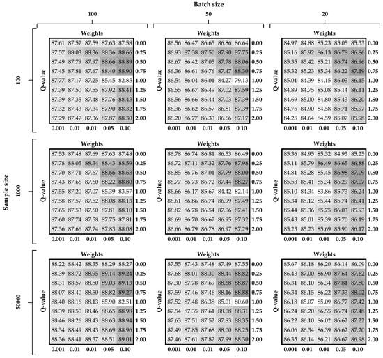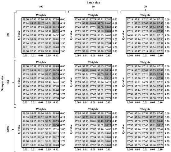 At the top of each chart there are three buckles pointing to the batch size used for stochastic gradient descent optimization algorithm. There are nine different tables (subfigures) inside the figure for each combination of the aforementioned parameters. Each table on the horizontal axes has the hyper-parameter value related to the regularization term (labels are at the top and values at the bottom of the subfigure). On the vertical axes, there are different values of the -parameter used in the Rényi loss function (labels are on the left and values are on the right of the subfigure). At the intersection of the last two described parameters there are accuracy measures (Equation (10)) calculated for the testing sample. Finally, we introduce a color palette for easier identification of promising intersections. Dark gray denotes situations when accuracy is the highest while white indicates areas with the lowest accuracy.