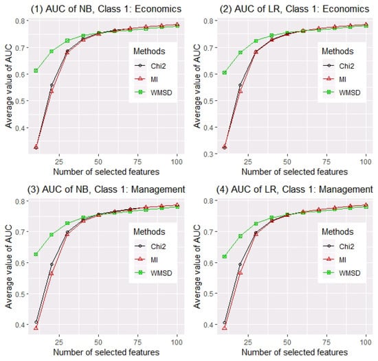 Next, we sample 10,000 abstracts as the training set and the others as the testing set randomly. For comparison of feature screening methods, different numbers of selected words d (from 10 to 100 by 10) are considered. The AUC values of two classification methods with different numbers of selected words are calculated for evaluating feature screening methods. For each setting, a total of 200 random replications are conducted. The averaged AUC values of two classifiers (i.e., NB and LR) over 200 replications for three feature screening methods (i.e., Chi2, MI and WMSD) with different number of selected words, when economics and management are considered as class 1 respectively, are reported in Figure 1. Panel (1) of Figure 1 shows that when naive Bayes classifier is applied and economics is considered as class 1, AUC values based on three estimated models (separately selected by Chi2, MI and WMSD) increase as d becomes larger. Obviously, WMSD far outperforms other methods when , and they perform similarly when . Panel (2) shows a similar result as panel (1) when logistic regression is applied. Panels (3) and (4) of Figure 1 show that, WMSD also far outperforms Chi2 and MI when , if the classes are exchanged.