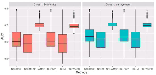Furthermore, the Pearson correlation coefficient method is used to determine the estimated model size of WMSD. To calculate , the parameters in Formulas (3) and (4) are set to be , and . The averaged is 25.86 over 200 replications. In each replication, for the same , AUC values of NB and LR based on three estimated models by Chi2, MI, WMSD are calculated separately. Figure 2 shows the boxplots of AUC for six situations (i.e., NB+Chi2, NB+MI, NB+WMSD, LR+Chi2, LR+MI and LR+WMSD) over 200 replications. It could be observed that, when the estimated model size is relatively small (actually, averaged is 25.86), WMSD performs more accurate and robust than Chi2 and MI in terms of AUC, whether economics or management is considered as class 1.