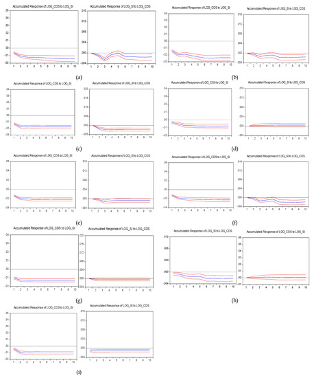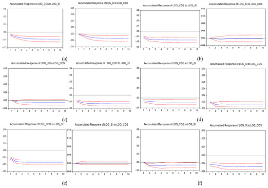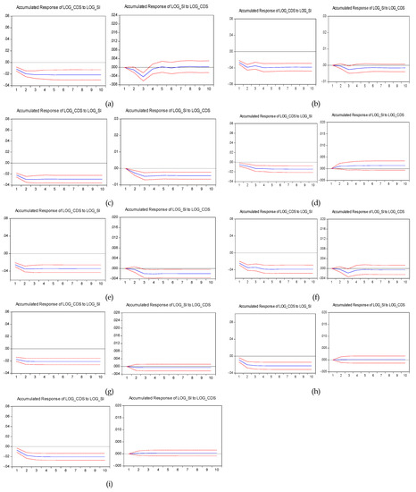 Further, the accumulated impulse responses of the CDS spread return and stock index return to one standard deviation shock to each other and their lagged values were calculated. The impulse response analysis illustrates the dynamic characteristics of the lead–lag relationship between the two markets. Daily sovereign CDS spread return (RCDS) and daily stock index return (RS) were treated as endogenous variables.