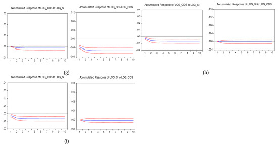 Impulse responses to one standard deviation for up to 10 lags over the period January 1, 2008–April 18, 2018 (%). Note: Countries: (a) Croatia; (b) Czech Republic; (c) Hungary; (d) Latvia; (e) Lithuania; (f) Poland; (g) Romania; (h) Slovakia and (i) Slovenia. The blue line displays the accumulated response of the CDS spread to one standard deviation shock in the return of the stock market and respectively, the accumulated response of the stock market return to one standard deviation shock in the CDS spread. The red short-dashed lines are the 95% confidence intervals. In the case of Latvia and Romania, stocks’ response to CDS was not statistically significant. CDSs’ response to stocks was not statistically significant in the case of Slovakia.