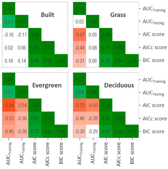 Correlation analysis between the model quality metrics tend to show consistent patterns for the relationships between metrics, but not for all land-covers (Figure 1). For example, AUCTesting and AUCTraining showed a positive correlation between them for all land-covers, except for grass where no correlation is present. Also, AUCTraining showed a negative correlation with AIC, AICc and BIC for all land covers, but not for built. AUCTesting was the metric showing the less stable pattern, with no relationship with AIC, AICc and BIC for built nor grass, but with negative relationship with these metrics for evergreen and deciduous cover. On the other hand, AIC, AICc and BIC showed consistent patterns of associations between them, presenting very strong positive correlations for all the analyzed land-covers (Figure 1).
